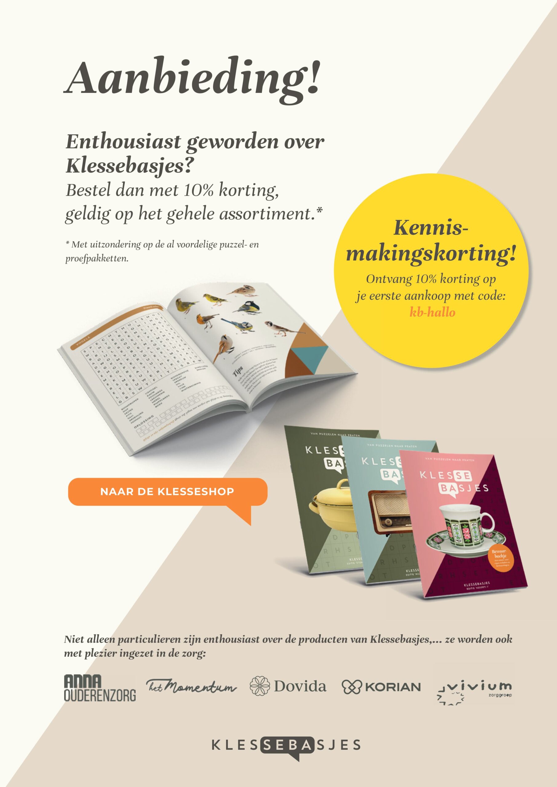 Werk jij in de zorg of heb je in jouw omgeving iemand met dementie? Geef diegene weer een verhaal met de puzzel- en prentenboekjes van Klessebasjes. Je probeert ze nu eenvoudig met onze 10% kennismakingkorting. Gebruik hiervoor couponcode: kb-hallo in de klesseshop!