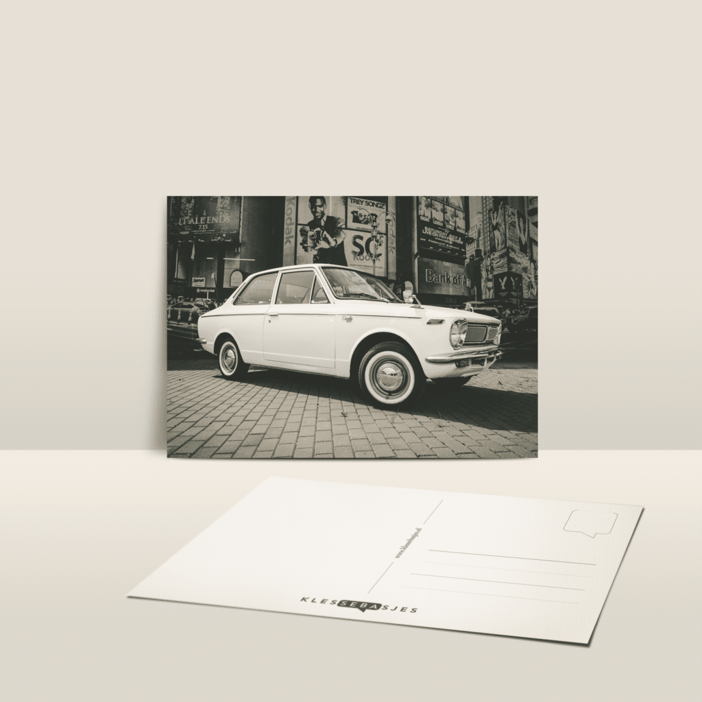 Postkaart met afbeelding van een oude Toyota Corolla.