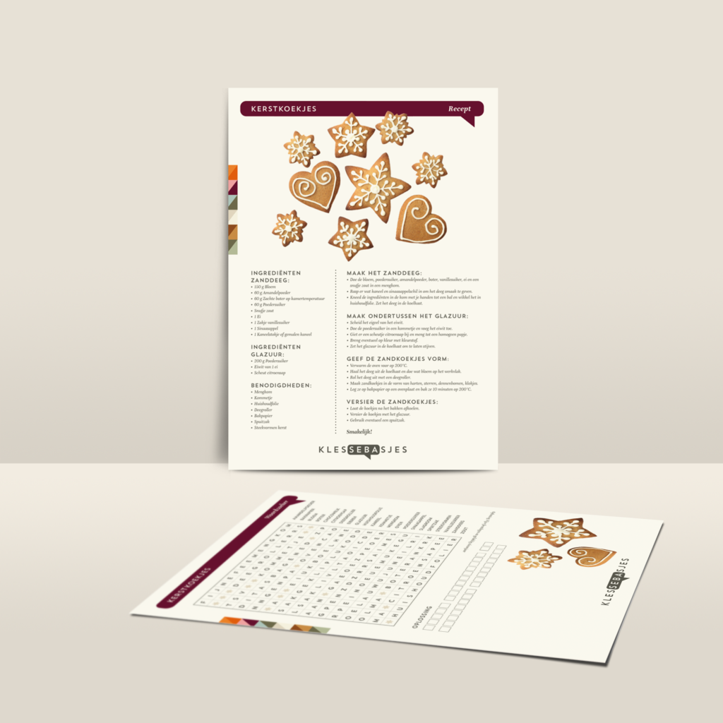 12 kerstballen met persoonlijke vragen, 24 kerstwensen om zelf uit te knippen, 5 vellen met kerstpuzzels, 5 vellen met recept en woordzoeker, 5 vellen met knutselwerk kerstboom