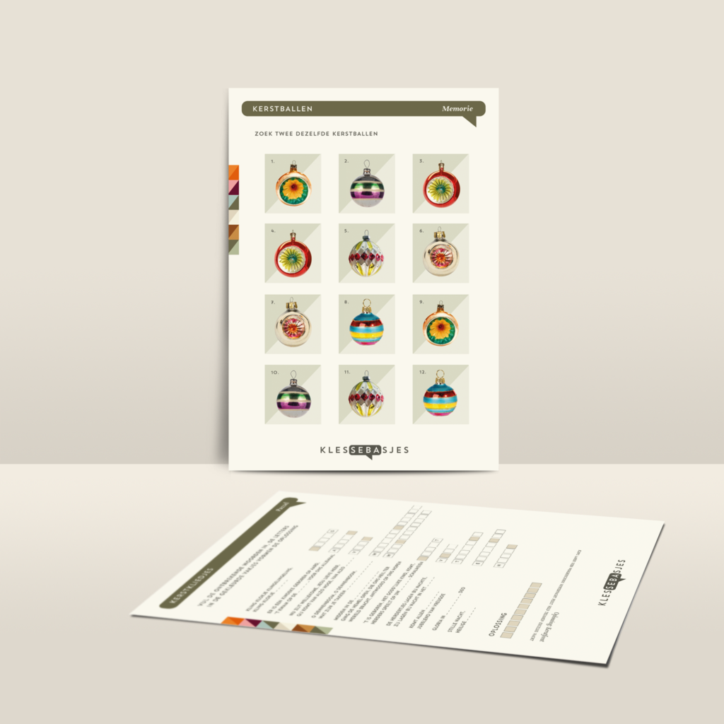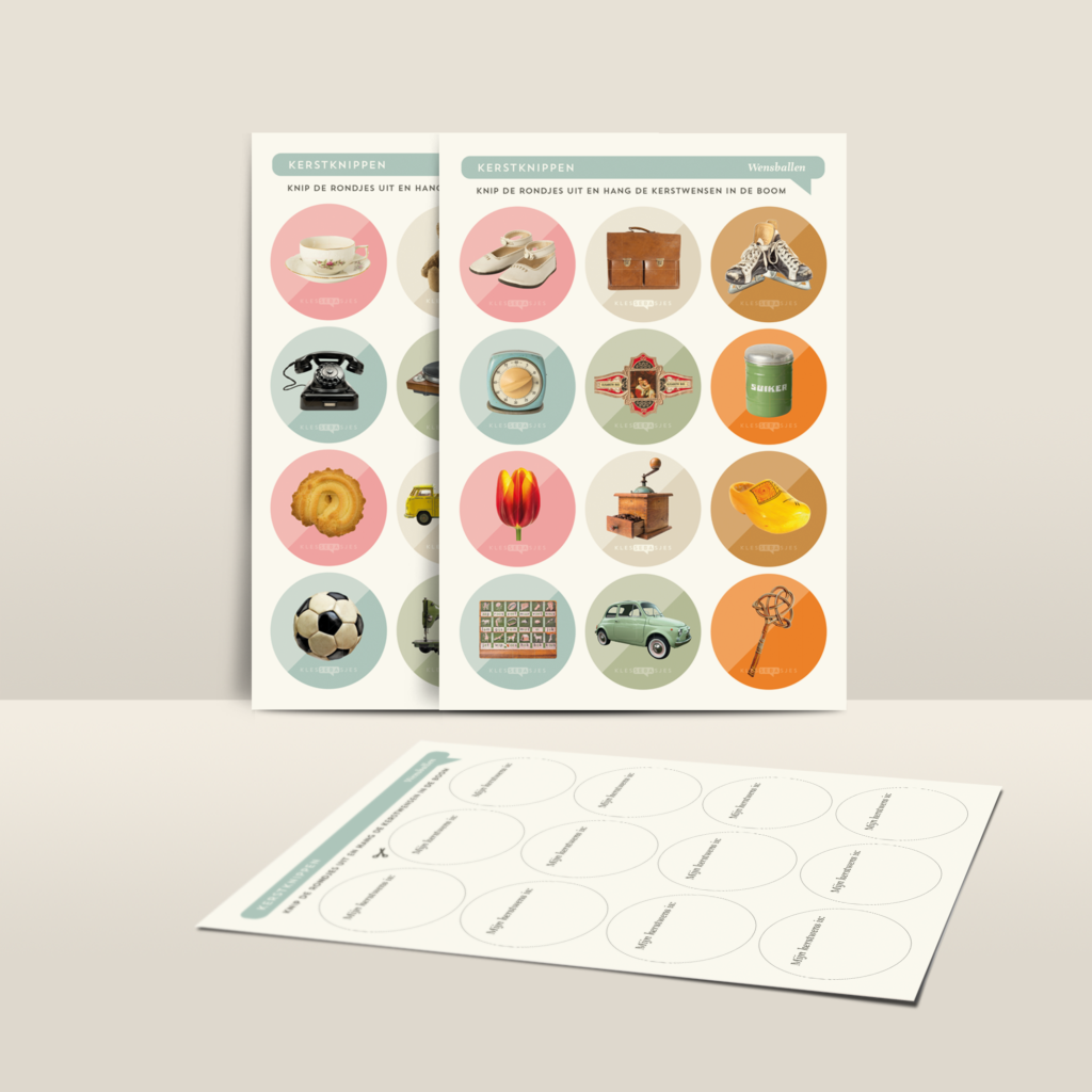 Papieren knutselset ‘Kerst’ bestaande uit kerstwensen om uit te knippen, woordpuzzels met zoekwoorden, liedjes, plaatjes, recept en knutselwerk. Hoe leuk om samen te beleven en terug te gaan naar de feestdagen van vroeger. Met als kers op de taart… of eigenlijk op de kerstboom, twaalf kerstballen met voorop een afbeelding en achterop een vraag over de tijd van toen. Dat roept leuke herinneringen en kletspraat op bij de kerstboom!